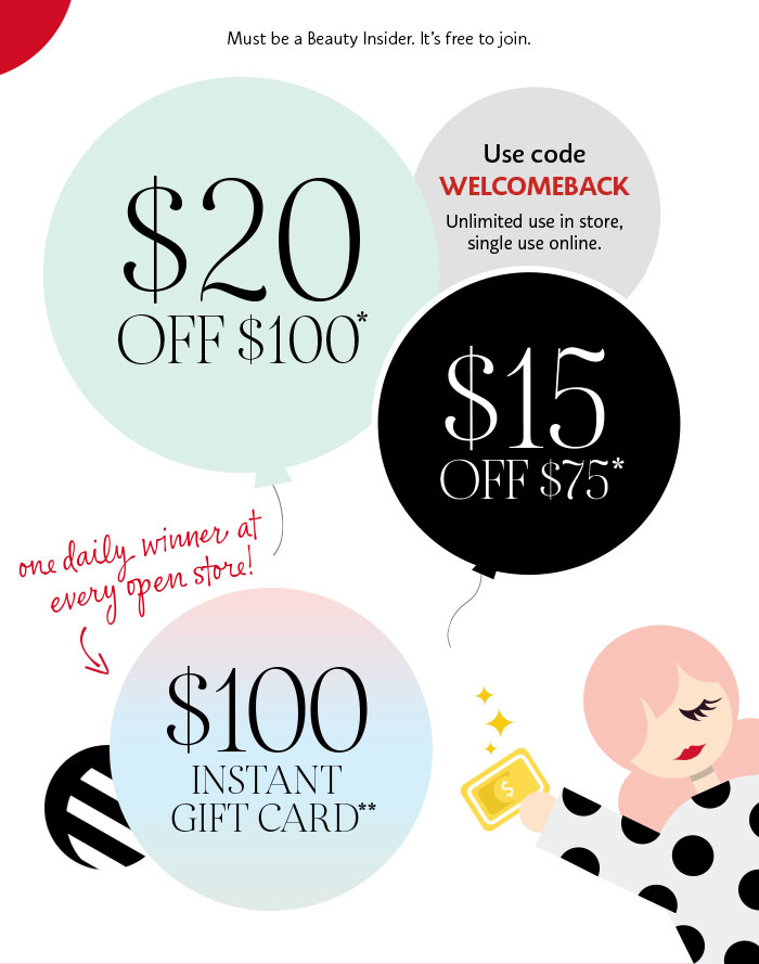 **Valid in (if open) Sephora US and Canada stores. Not valid in Sephora inside JCPenney stores, on jcp.com, sephora.com, sephora.ca, or Instagram Checkout. NO PURCHASE NECESSARY. A PURCHASE WILL NOT INCREASE YOUR CHANCES OF WINNING. LEGAL RESIDENTS OF THE 50 UNITED STATES (D.C.) AND CANADA 18 YEARS AND OLDER. VOID WHERE PROHIBITED. Instant Win Game ends 8/23/20. For Official Rules, prize descriptions, and odds disclosure, visit welcomebackgiveaway.com. This contest is not administered by Dyson. If Canadian resident, mathematical-skill-testing question to be correctly answered in order to win. 20,702 prizes (approximate retail values from $11 to $699.99 CAD) available to be won. $100 Sephora gift card prizes expire 8/30/20. Sponsor: Sephora USA, Inc., 525 Market St., San Francisco, CA 94105, USA. Sephora and JCPenney employees are not eligible for this offer. | |
